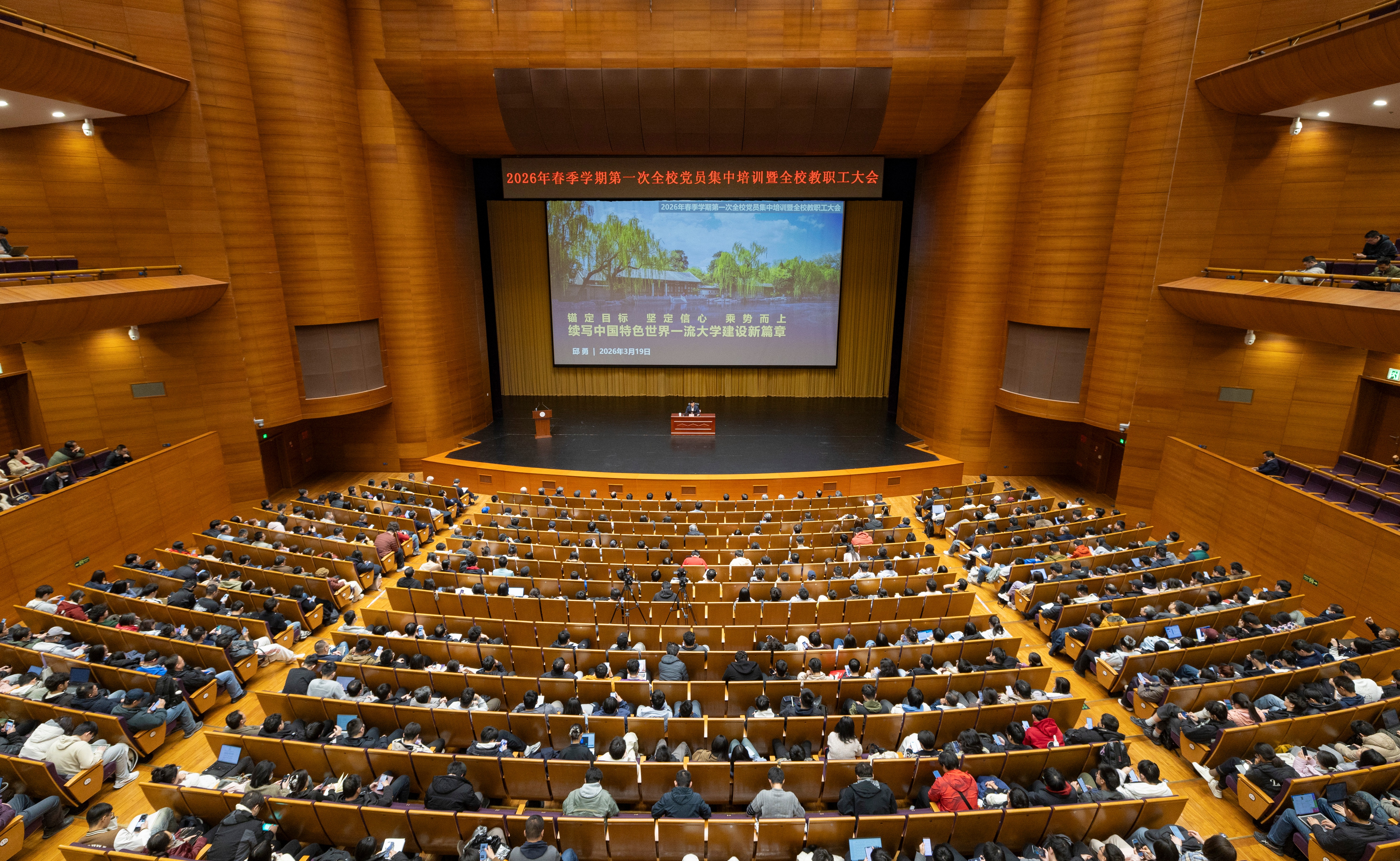 3月19日下午,清华大学举行2026年春季学期第一次全校党员集中培训暨全校教职工大会,传达学习习近平总书记在全国两会期间的重要讲话和全国两会精神,介绍“十五五”时期学校建设发展的主要目标任务,通报部署新一年度重点工作。校党委书记邱勇,校党委副书记、校长李路明出席并作部署,校党委常务副书记向波涛主持会议。